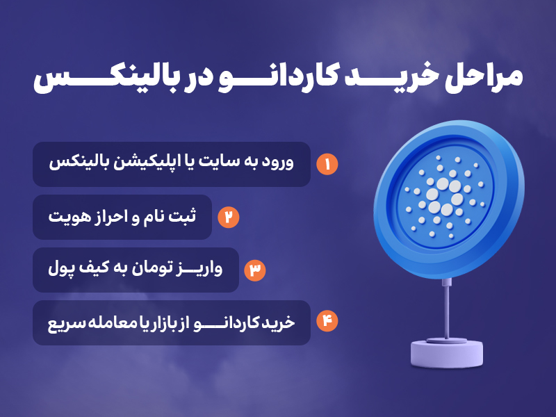 کاردانو یکی از صدها ارز دیجیتال معتبر است که در صرافی بالینکس معامله میشود. این صرافی شرایط لازم برای خرید راحت و آسان کاردانو را برای کاربران فراهم کرده است. شما میتوانید ارز دیجیتال ADA را با پرداخت کارمزد پایین و در کمترین زمان ممکن از صرافی بالینکس خریداری کنند. در حالت کلی نحوه خرید کاردانو در صرافی بالینکس به صورت زیر است: